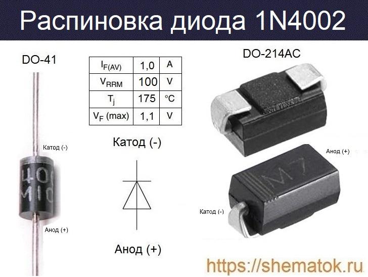 Максимальное пиковое обратное напряжение у 1N4002, согласно техническим характеристикам, не превышает 100 В. Эта сверхминиатюрная, по своим габаритам, радиодеталь является очень популярным в использовании выпрямительным диодом, способным выдерживать довольно большие импульсные токи до 30 А. При этом, оно является одним из самых слабых в серии 1N400x.