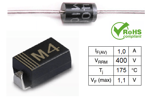 1n4004 бывает и в smd-упаковке DO-214AC для поверхностного монтажа. По своим электрическим параметрам они мало отличаются от аналогичных в классическом корпусе DO-204AL. Имеют маркировку «M4».
