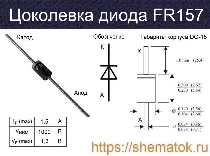 Диод FR157 обладает пластиковой огнеупорной упаковкой DO-15. Металлические выводы изготовлены с применением американского военного стандарта испытаний MIL-STD-202E, методом 208. Вес изделия не более 0.38 г. Катодная сторона отмечена на корпусе серой полосой. Внешний вид, габариты и распиновка устройства представлены на рисунке.