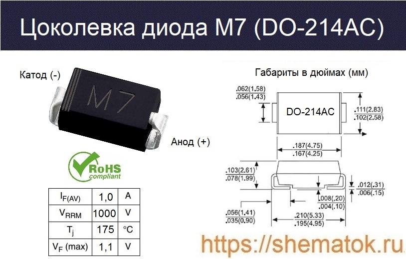 Согласно техническим характеристикам электронное устройство с маркировкой М7 представляет собой выпрямительный диод в smd-корпусе. Относится к маломощной серии 1n400x предназначенной для работы в цепях с постоянным током до 1 А. Основу конструкции изделия составляет кремниевых PN-переход. Новые версии удовлетворяют европейскому экостандарту «RoHS» и огнестойкости по правилам UL94-V0.