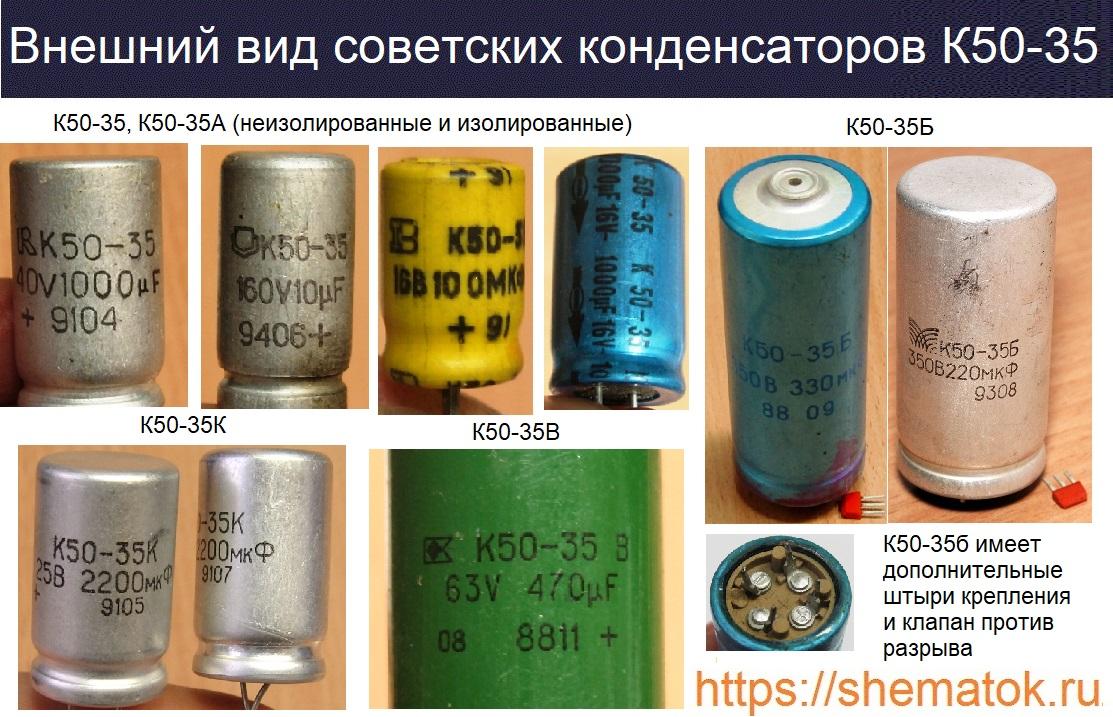 Фотографии советских К50-35 из 80-х представлены ниже. Их внешний вид во многом зависит от года выпуска и параметров, на которые были рассчитаны устройства. Корпус у конденсаторов состоит преимущественно из сплава алюминия. Для умеренного и холодного климата (УХЛ) выпускались изделия с изоляционным покрытием разных цветовых гамм, в том числе в прозрачной оболочке с синеватым оттенком.