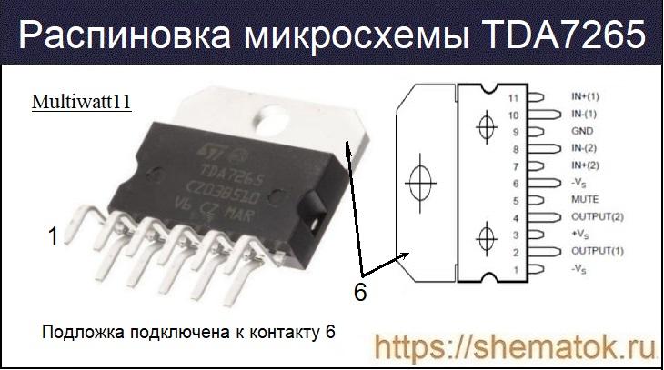 Полная распиновка TDA7265 в пластикой упаковке «Multiwatt11», в которой производится микросхема, представлена на изображении ниже. Корпус имеет 11 гибких выводов, предназначенных для дырочного монтажа на плату. Металлическая подложка оснащена специальным отверстием для крепления на радиатор.