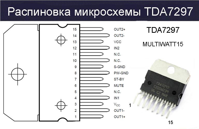 По техническим характеристикам TDA7297 (которые указаны в datasheet), является двухканальным усилителем звуковой частоты (класс АВ), по 15 Вт на каждый канал. Для создания схем УНЧ на его основе требуется минимальный набор электронных компонентов. Разработан специально для применяется в телевизионной технике и портативных радиоприемниках. Эта микросхема оснащена встроенными функциями: отключения звука (Mute), режимом сна (St-By), защитой от КЗ и перегрева. Имеет большой диапазон питающих напряжений (от 6 до 18 В), поэтому очень популярна у радиолюбителей.