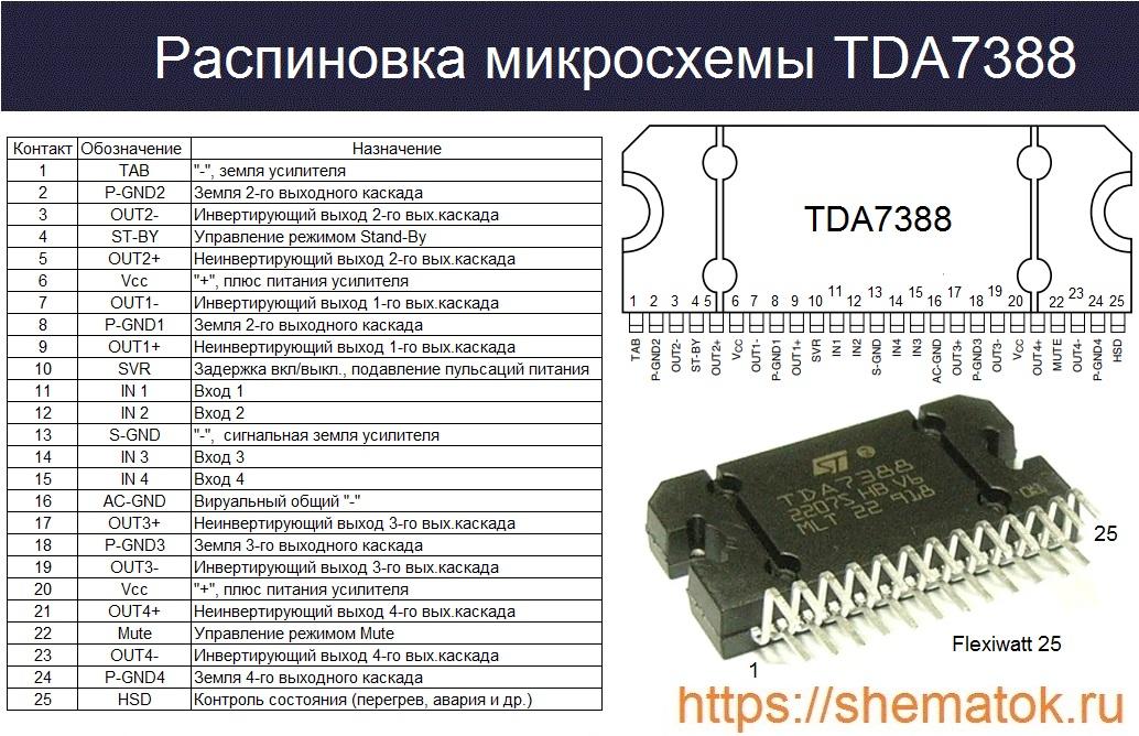 Распиновка TDA7388 включает 25 контактов размещенных в современном пластиковом корпусе Flexiwatt 25. Земляные «TAB», «P-GND» и «S-GND» выведены отдельно для предотвращения паразитных наводок силовой части на входные цепи микросхемы. Назначение выводов на русском и английском языке представлено на рисунке.