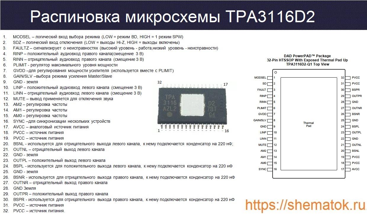 В статье рассмотрены характеристики микросхемы TPA3116D2 (из datasheet), входящей в состав популярной серии современных цифровых (импульсных) усилителей звуковой частоты TPA31xxD2 класса D от компании Texas Instrument. Эти малогабаритные изделия предназначены для усиления как моно (PBTL), так и стереозвука (BTL). Имеют продвинутую модуляцию способствующую подавлению искажений и помех. Поддерживают включение нескольких подобных устройств в цепочку вроде ведущих-ведомый (master-slave) для создания различных схем на его основе.