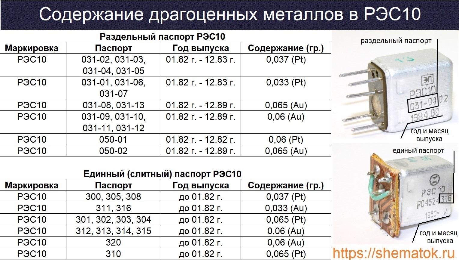 Во всех вариантах исполнения надо обращать внимание на последние символы, например «302» в конце паспорта рэс-10 означает что в ней есть драгметаллы. Такие цифры обычно присутствуют в старой маркировке, вроде «рс4524302». Если под ней указана дата не позднее 01.1982 г., то можно смело утверждать, что в данном изделии находится сплав платины (ПЛИ-10) в количестве 0,065 гр.