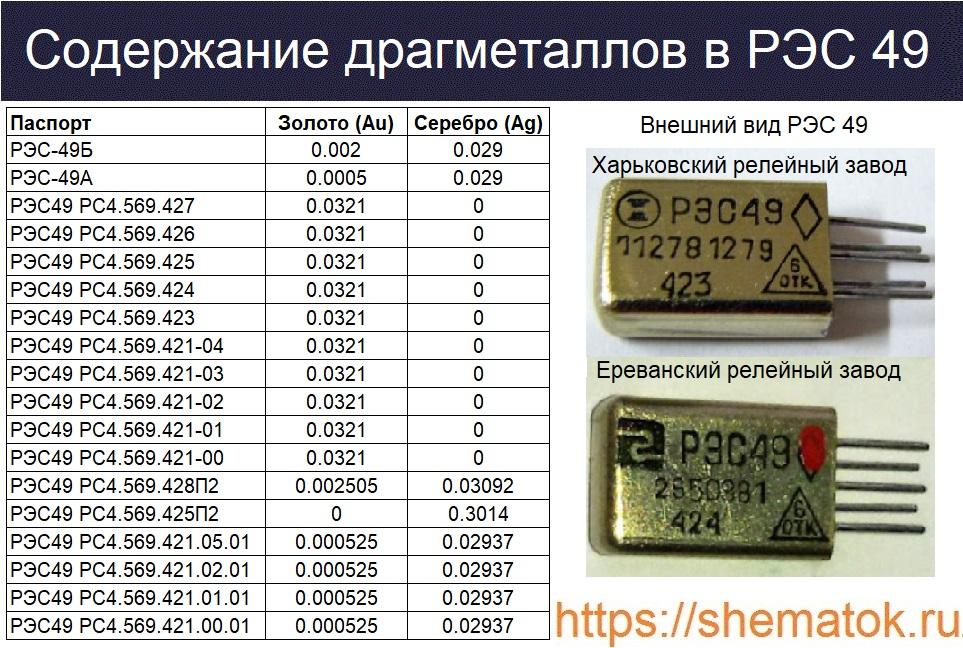 В статье рассмотрено содержание драгметаллов в РЭС 49, являющимся одним из самых распространенных реле советского периода. Наличие внутри ценных металлов зависит от даты выпуска, а также предприятия-изготовителя. Чаще всего им интересуются из-за технического золота, которого на самом деле очень мало в данном устройстве.