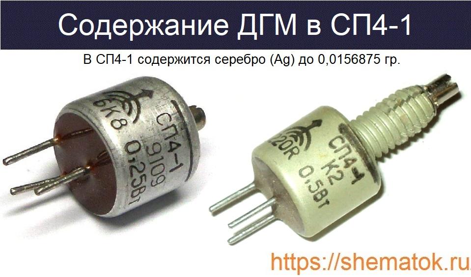 Содержание драгметаллов в отечественном переменном резисторе СП4-1 незначительное. В состав изделия входит небольшое количество серебра. Данный ценный металл нанесён преимущественно на внешние контакты. Цилиндрический корпус выполнен из сплава технического алюминия.