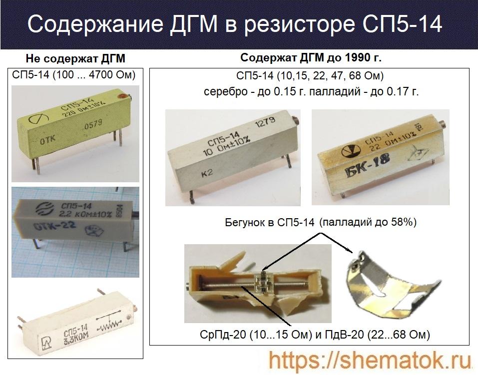 Содержание драгоценных металлов в советских резисторах СП5-14 зависит от даты выпуска и номинального сопротивления. ДГМ присутствует преимущественно в проволоке из серебрянно-палладиевых сплавов СрПд-20 (10 и 15 Ом) и ПдВ-20 (22,33,47 и 68 Ом). До 58% палладия находится внутри изделия на подвижном контакте, который скупщики лома называют «бегунком».