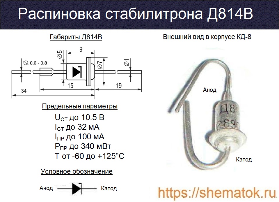 Д814В встречается только в упаковке советского образца КД-8. Масса изделия составляет не более 1 грамм. Вместе с символьно-буквенной маркировкой на корпусе присутствует месяц и год выпуска. Внешний вид и распиновка стабилитрона представлены на рисунке ниже.