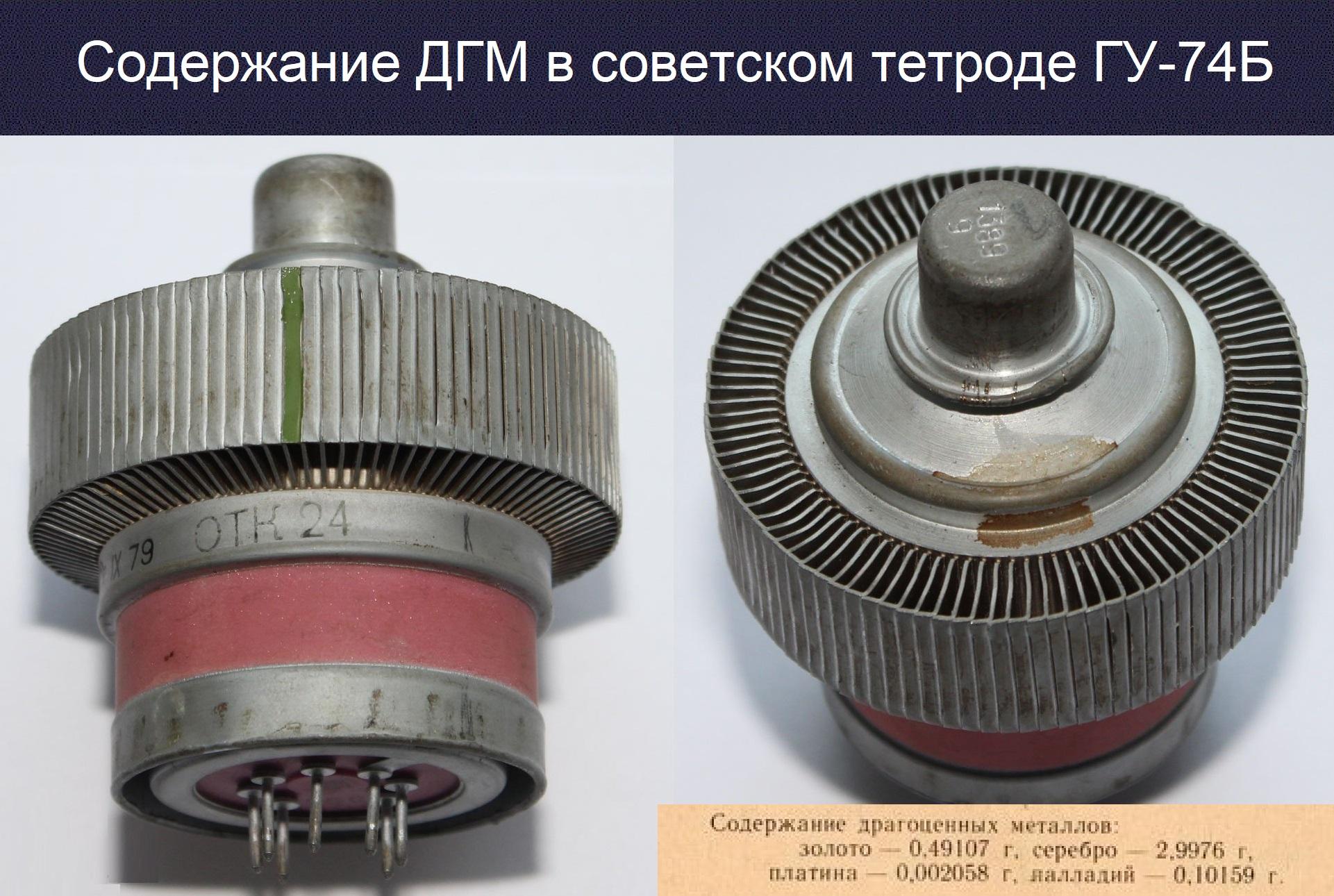 Выпускаемый в советские времена генераторный тетрод ГУ-74Б не всегда имел одинаковое содержание драгметаллов (ДГМ). В самом начале производства, примерно в 70-х, ценных металлов в нём было больше. В дальнейшем, вместе с введением мер экономии на предприятиях, их количество постепенно снижалось.