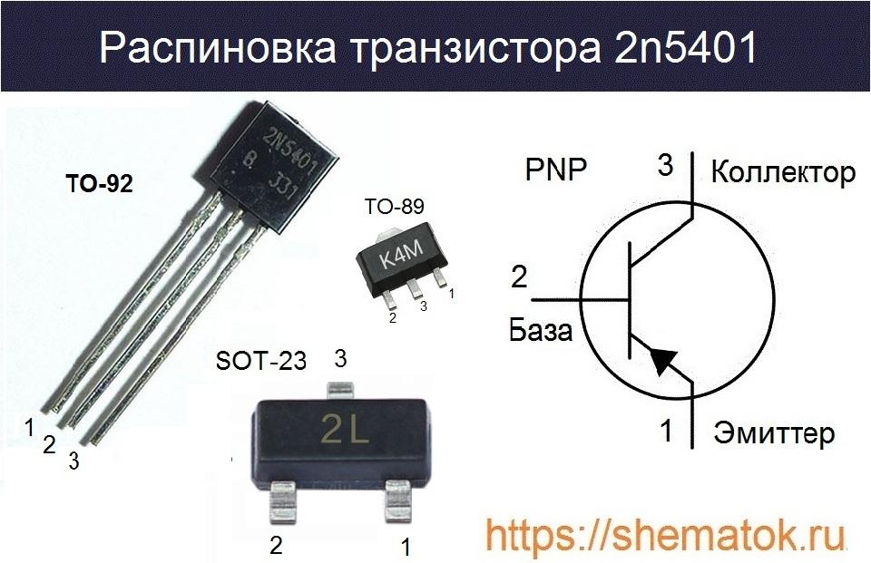 Стандартная цоколевка 2n5401, если смотреть на маркировку, слева на право: эмиттер, база, коллектор. Он изготавливается в пластмассовом корпусе с гибкими ножками. Большинство производителей делают его в корпусе TO-92.