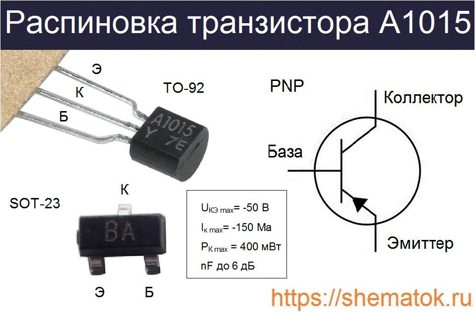 A1015 имеет следующую распиновку. Он выпускаются только в двух стандартных пластмассовых корпусах, имеющих три металлических контакта, с назначением: эмиттер (Э), коллектор (К), база (Б). ТО-92 — ЭКБ. У SOT-23, в нижней части расположены выводы «Э» и «Б», а сверху «К». Для наглядности представим эти данные на рисунке.