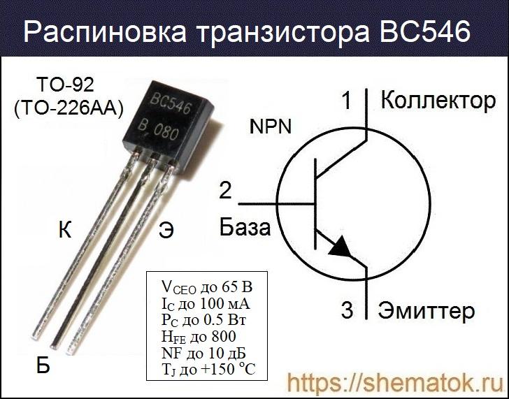 У BC546 в корпусе ТО-92 стандартная цоколевка: слева – коллектор (К), посередине – база (Б), справа – эмиттер (Э). При этом некоторые производители выпускают данный транзистор и в устаревшей упаковке ТО-18. Более подробно, внешний вид, основные параметры и распиновка показаны на изображении ниже.