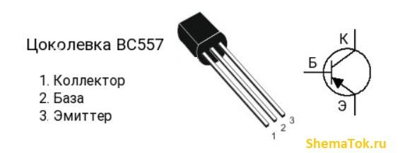 Цоколевка кремниевого p-n-p транзистора ВС557 производят в пластмассовом корпусе ТО-92 с гибкими выводами.