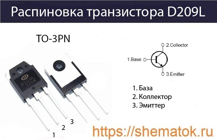 Внешний вид и распиновка D209L представлены на рисунке. На фотографии видно, что устройство изготавливается в усиленном пластмассовом корпусе ТО-3PN и его разнообразных модификациях. Слева на право расположены выводы: база (Б), коллектор (К), эмиттер (Э).