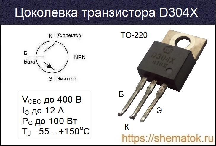 В статье рассмотрены основные технические характеристики мощного биполярного NPN-транзистора D304X. Он довольно часто встречается в устаревших моделях импульсных блоков питания, энергосберегающих приборах, инверторах, схемах общего усиления и др. Выделяется хорошей надёжностью, высокой скоростью переключений (fгр. от 2.5 МГц), большим пропускным напряжением (VCEO до 400 В) и током (IC до 12 В). Коэффициент усиления (HFE) у некоторых экземпляров достигает 40.