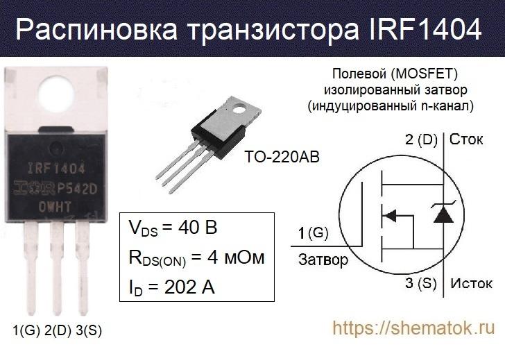 Наиболее распространенная версия IRF1404 оснащена пластиковым корпусом TO-220AB. Три металлических вывода имеют характерное для подобных транзисторов назначение (слева на право): затвор (G), сток (D), исток (S). Внешний вид, условное обозначение и распиновка представлены на рисунке.