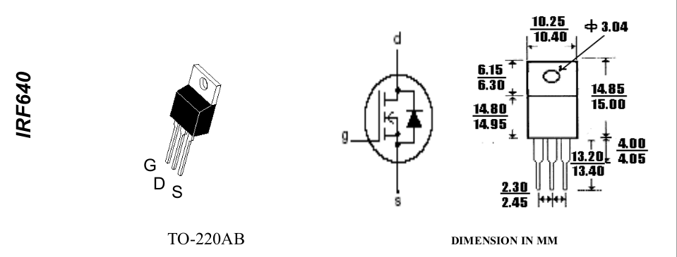 Цоколевка IRF640 выполнена в пластмассовом корпусе ТО-220АВ с жесткими выводами. На рисунке ниже показано расположение их и геометрические размеры корпуса.