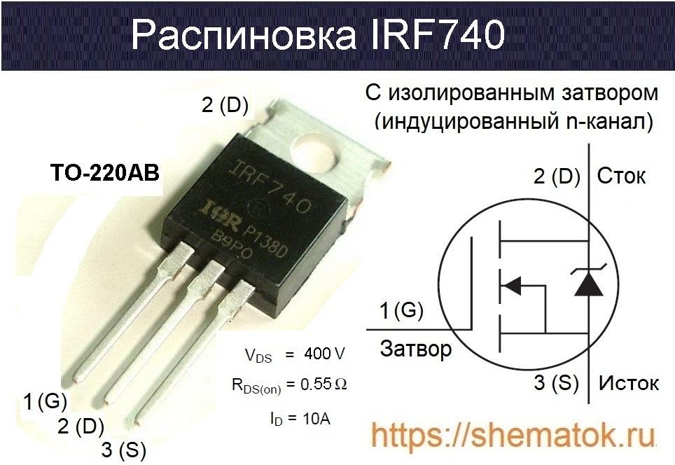 IRF740 — это N-канальный мощный полевой MOSFET-транзистор компании International Rectifier (IR) с изолированным затвором. В настоящее время производится компанией Vishay (преемницей IR) с другим наименованием, указанным в даташит — SiHF740. Он способен переключать нагрузки до 400 В, потребляющие до 10 А c пороговым напряжением на затворе до 10 В. При этом мощность рассеивания не должна превышать 125 Вт. Заявленное производителем сопротивление в открытом состоянии достаточно низкое и составляет 0,55 Ом.
