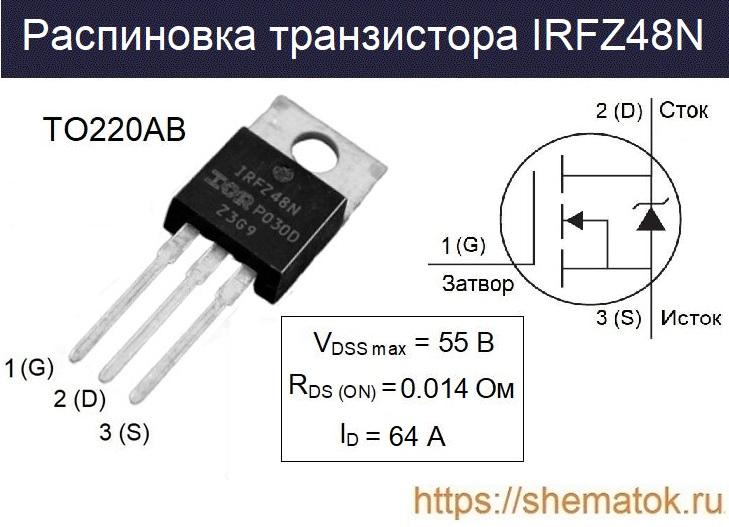Практически все производители выпускают IRFZ48N в корпусе ТО-220AB. Для того, чтобы определить распиновку, необходимо расположить транзистор так, чтобы видеть его маркировку, при этом гибкие металлические ножки должны находиться в нижней части. Назначение выводов, в этом случае, будет (слева на право): затвор (З), сток (С), исток (И). Внешний вид, основные параметры, цоколевка представлены на рисунке ниже.