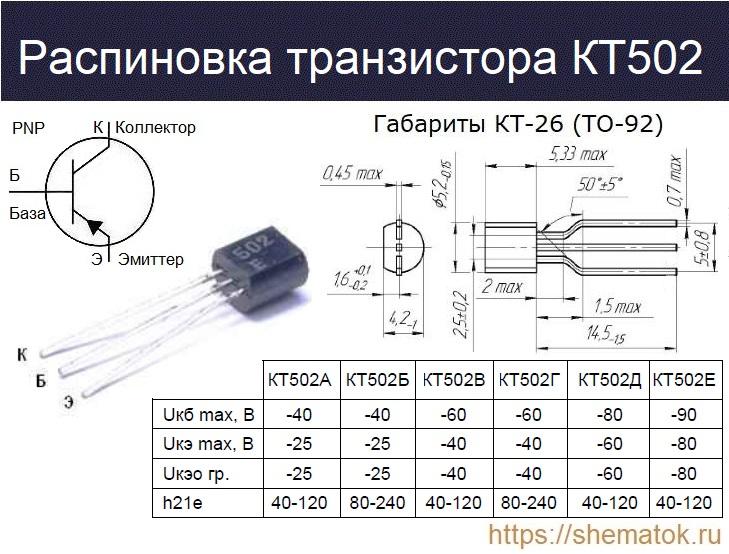 У серии устройств КТ502 в корпусе КТ-26 следующая цоколевка: коллектор (К), база (Б), эмиттер (Э). Рассматриваемый транзистор выполнен согласно ТУ аАО. 336.182 ТУ/02. С внешним видом, габаритами и основными параметрами можно ознакомиться на рисунке ниже.