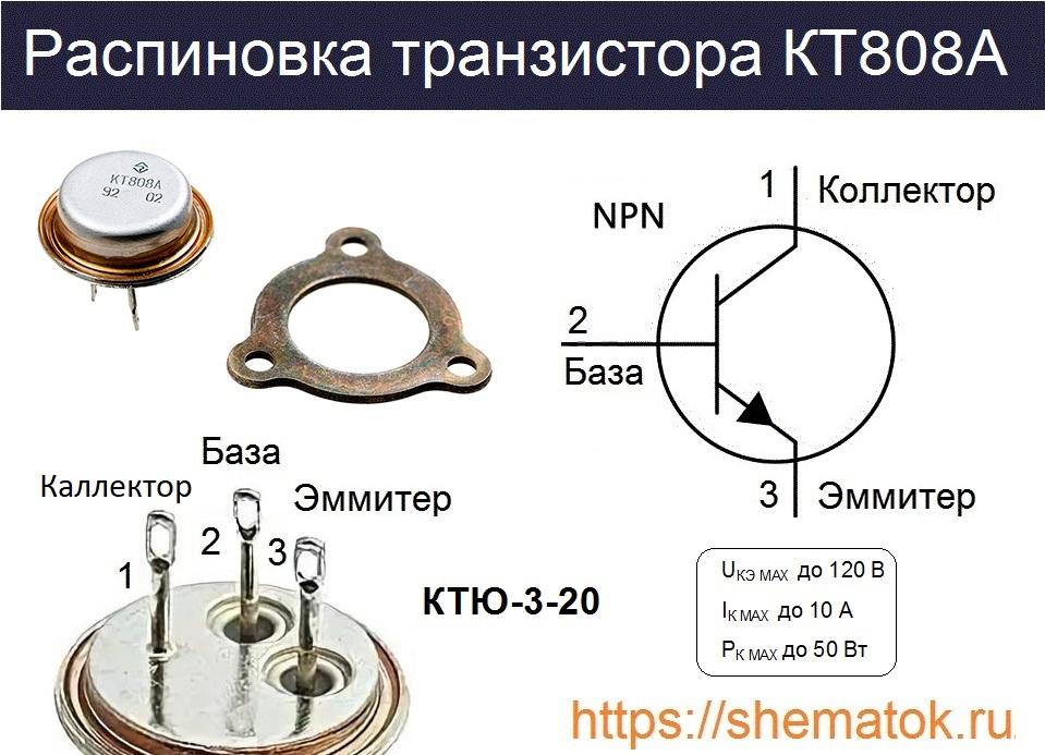 Цоколевка у КТ808А типовая для металлического корпуса КТЮ-3-20 со стеклянными изоляторами и жесткими ножками. Если смотреть на устройство снизу, то коллектор будет визуально отличатся от других контактов. Выводы эмиттера и базы, немного утоплены в основании металлизированной упаковки.