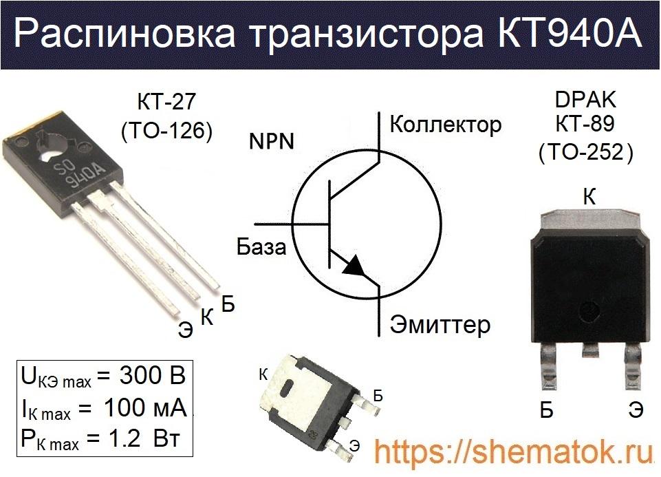 Транзистор KT940А имеет следующую цоколевку. Он выпускается в пластиковом корпусе, который имеет два варианта исполнения: КТ-27 (зарубежный аналог ТО-126), КТ-89 (TO-252). Для устройств в упаковке КТ-27 левая ножка – это эмиттер (Э), средняя коллектор (К), правая база (Б).