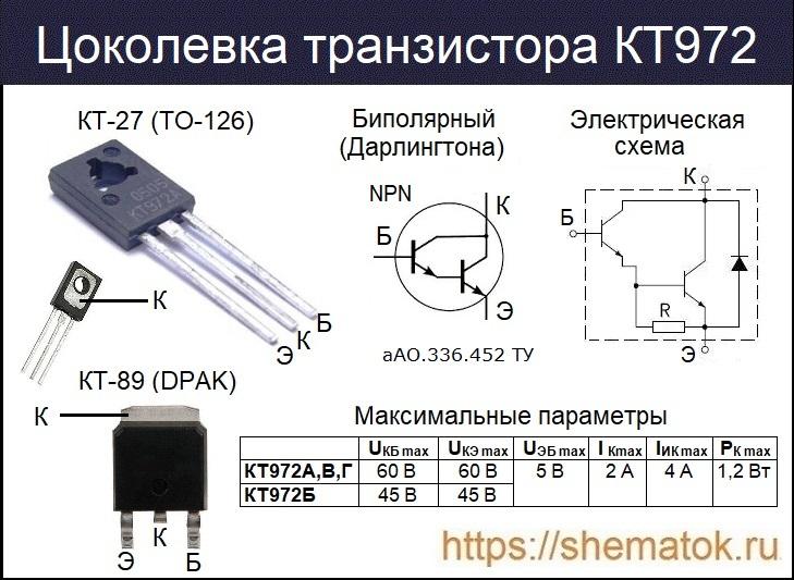 Транзисторы выпускается в пластиковых корпусах двух типов (КТ-27 и КТ-89), цоколевка КТ972 у них разная. У первого варианта исполнения (слева на право): эмиттер (Э), коллектор (К), база (Б). Внешний вид обоих и электрическая схема представлены на изображении ниже.