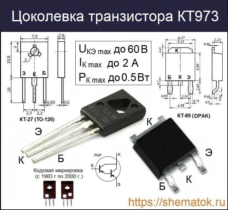 Цоколевка транзисторов из серии КТ973 в пластиковом корпусе КТ-27 (слева на право): Э, К, Б. На изображении ниже представлены внешний вид, условное обозначение и распиновка транзисторов в упаковке КТ-89. Задняя часть (металлическая подложка) имеет физическое соединение с коллектором.